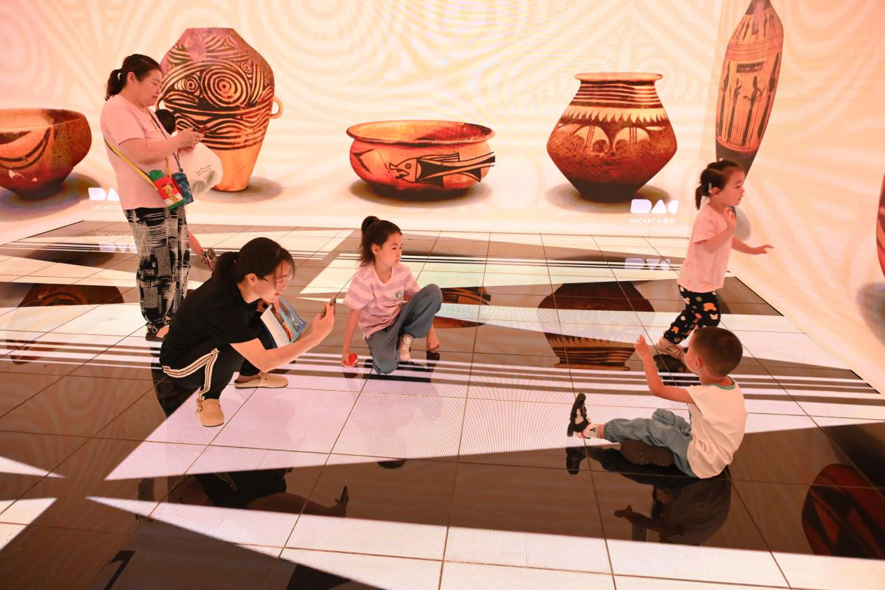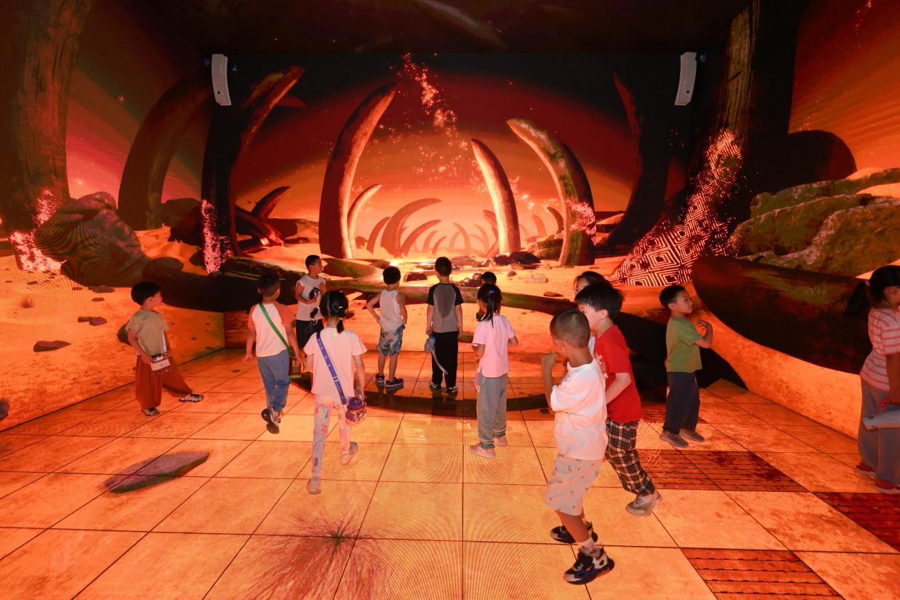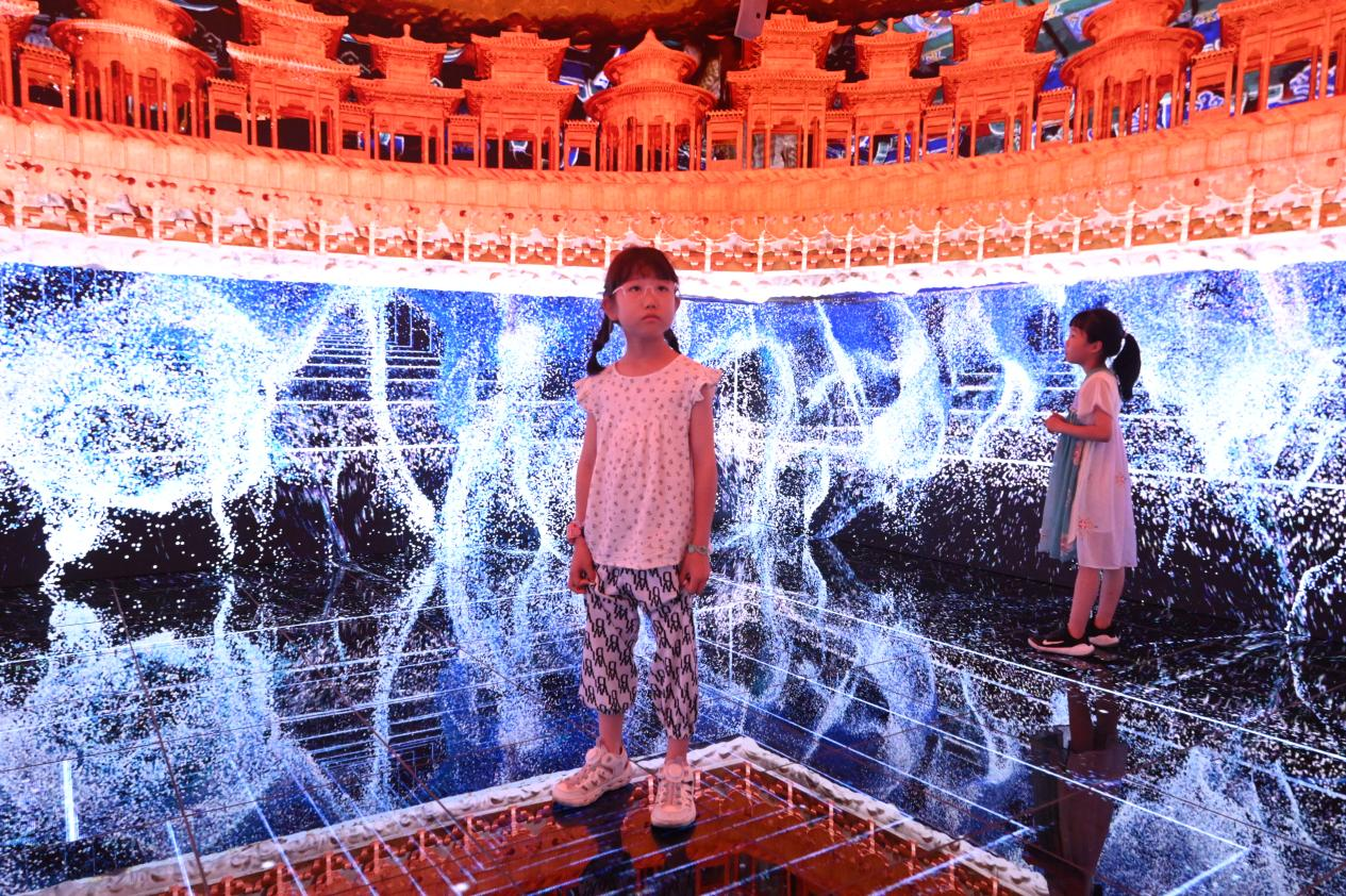 走进六面环绕的led屏幕构建的cave沉浸式全景体验空间,观众时而置身于古代建筑的瑰丽世界。