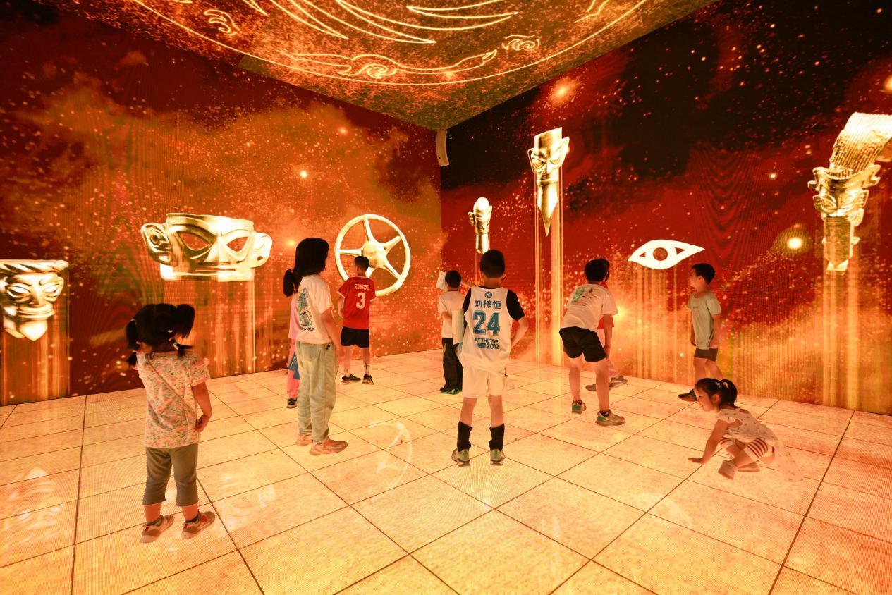 听!这是来自古蜀文明的召唤:当指尖轻触屏幕,青铜神兽、青铜太阳形器等文物仿佛被唤醒,轮廓逐渐清晰,在肢体交互与眼神交汇中,它们缓缓“苏醒”,仿佛在向你诉说古蜀国的经年往事,带你揭开那段神秘历史的神秘面纱。