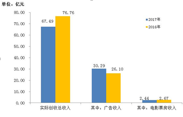 2017年6月,北京市广播影视创收总收入67.49亿元,比去年同期减少9.27亿元,同比下降12.08%。其中广告收入30.29亿元,占本月创收总收入的44.88%,比去年同期增加4.19亿元,同比增长16.05%。电影票房收入2.44亿元,占本月创收总收入的3.62%,比去年同期减少0.23亿元,同比下降8.61% 。