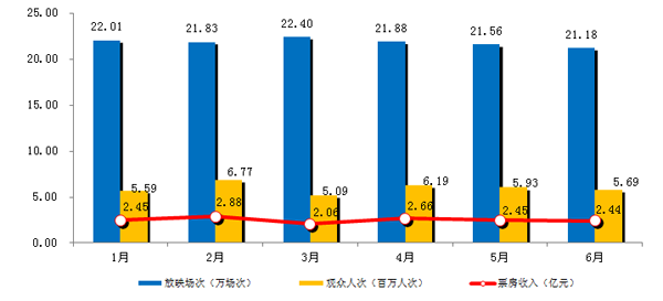 6月份北京城市影院放映电影21.18万场,比去年同期增长21.82%,环比下降1.77%;观影人数5.69百万人次,比去年同期增长0.59%,环比下降4.00%;票房收入2.44亿元,比去年同期下降8.61%,环比下降0.41%。