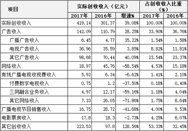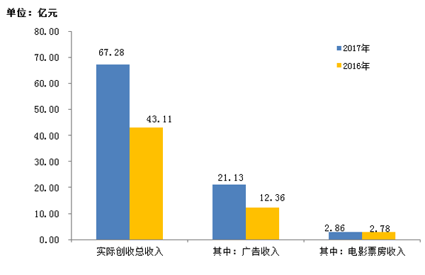 2017年7月,北京市广播影视创收总收入67.28亿元,比去年同期增加24.17亿元,同比增长56.07%。其中广告收入21.13亿元,占本月创收总收入的31.41%,比去年同期增加8.77亿元,同比增长70.95%。电影票房收入2.86亿元,占本月创收总收入的4.25%,比去年同期增加0.08亿元,同比增长2.88% 。