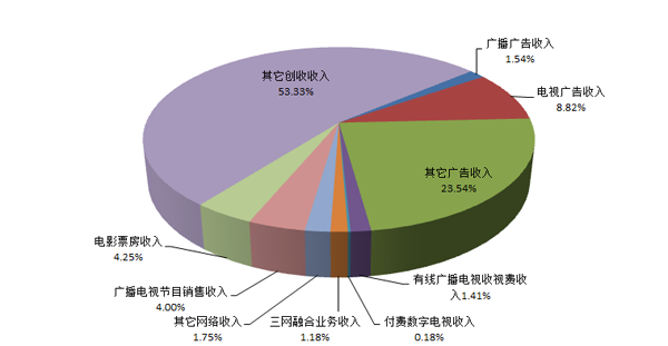 截止到7月底,北京市广播影视累计创收总收入为419.14亿元,比去年同期增加117.77亿元,同比增长39.08%。其中,广告收入为142.09亿元,占创收总收入的33.90%,比去年同期增加31.3亿元,增长28.25%;广播电视节目销售收入16.75亿元,占创收总收入的4.0%,比去年同期减少11.97亿元,同比41.68%;电影票房收入为17.80亿元,占创收总收入的4.25%,比去年同期减少0.5亿元,同比下降2.73%。