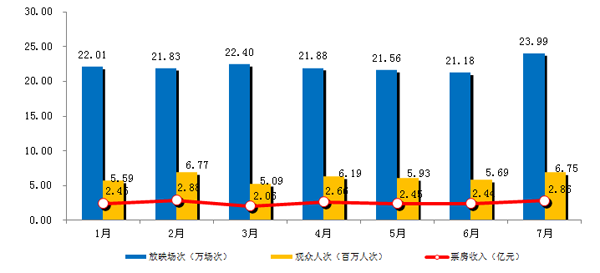 7月份北京城市影院放映电影23.99万场,比去年同期增长19.21%,环比增长13.27%;观影人数6.75百万人次,比去年同期增长7.14%,环比增长18.63%;票房收入2.86亿元,比去年同期增长2.88%,环比增长17.21%。