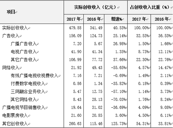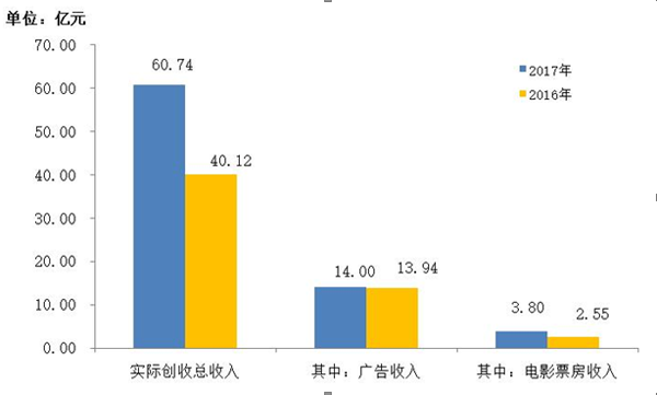 2017年8月,北京市广播影视创收总收入60.74亿元,比去年同期增加20.62亿元,同比增长51.4%。其中广告收入14亿元,占本月创收总收入的23.05%,比去年同期增加0.06亿元,同比增长0.43%。电影票房收入3.8亿元,占本月创收总收入的6.26%,比去年同期增加1.25亿元,同比增长49.02% 。