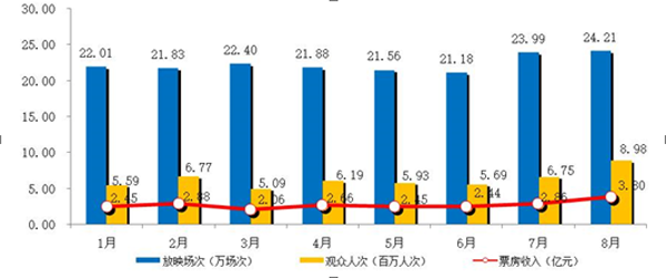 8月份北京城市影院放映电影24.21万场,比去年同期增长15.78%,环比增长0.92%;观影人数8.98百万人次,比去年同期增长49.9%,环比增长33.04%;票房收入3.8亿元,比去年同期增长49.02%,环比增长32.87%。