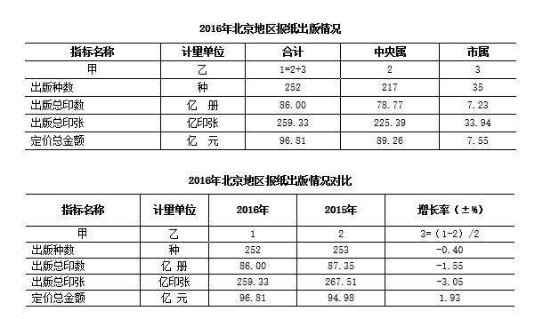 2016年,北京地区出版报纸252种,比上一年减少1种;平均期印数3297万份,比上一年下降2.73%;总印数86亿份,比上一年下降1.55%;总印张259.33亿印张,比上一年下降3.05%;定价总金额96.81亿元,比上一年增加1.93%。