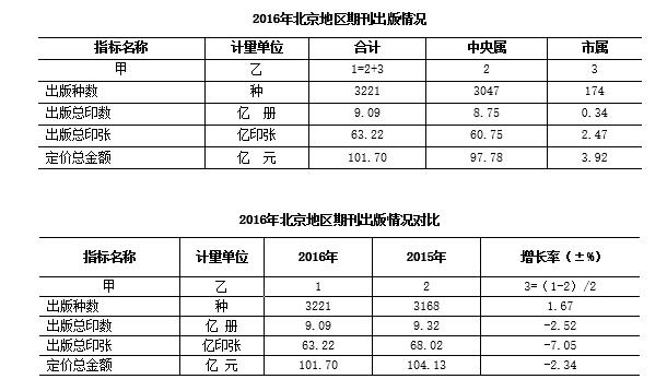 2016年,北京地区出版期刊3221种,比上一年增加53种;平均期印数5471万册,比上一年下降1.22%;总印数9.09亿册,比上一年下降2.52%;总印张63.22亿印张,比上一年下降7.05%;定价总金额101.7亿元,比上一年下降2.34%。