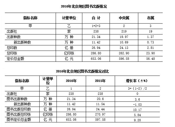 2016年,北京地区出版图书213413种,其中新出图书114211种,重版、重印图书99202种,分别比上一年增长3.60%、下降1.03%和增长9.50%,重印率为46.48%。总印数26.94亿册(张),比上一年增长10.17%;总印张286.80亿印张,比上一年增长5.84%;定价总金额653.06亿元,比上一年增长9.28%。