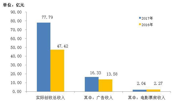 2017年11月,北京市广播影视创收总收入77.79亿元,比去年同期增加30.37亿元,同比增长64.04%。其中广告收入16.33亿元,占本月创收总收入的20.99%,比去年同期增加2.75亿元,同比增长20.25%。电影票房收入2.04亿元,占本月创收总收入的2.62%,比去年同期减少0.23亿元,同比下降10.13% 。