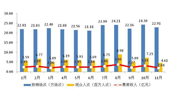 11月份北京城市影院放映电影22.91万场,比去年同期增长20.61%,环比下降5.71%;观影人数4.61百万人次,比去年同期下降9.99%,环比下降36.45%;票房收入2.04亿元,比去年同期下降10.13%,环比下降35.85%。