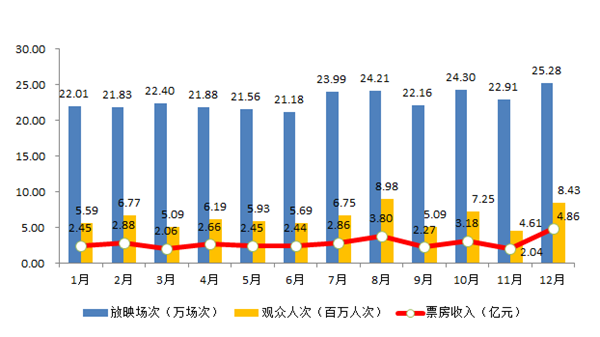 截止到12月底,北京城市影院累计放映电影273.71万场,比去年同期增加45.36万场,增长19.86%;观影人次76.36百万人次,比去年同期增加7.63百万人次,增长11.1%;票房收入为33.95亿元,比去年同期增加3.67亿元,增长12.12%。