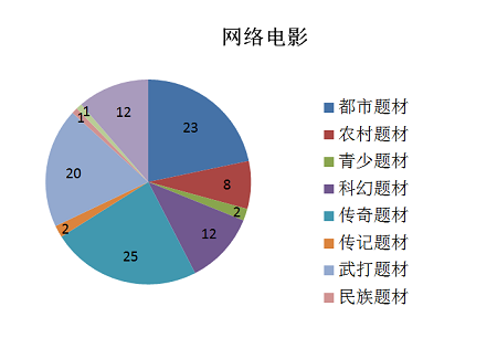 106部网络电影中,都市题材23部,农村题材8部,青少题材2部,科幻题材12部,传记题材2部,传奇题材25部,武打题材20部,民族题材1部,司法题材1部,其它题材12部。