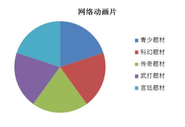 5部77集网络动画片中,青少题材1部12集,科幻题材1部24集,传奇题材1部1集,武打题材1部16集,宫廷1部24集。