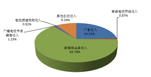 从实际创收收入构成来看,广告收入[2]为123.59亿元,比上年同期减少25.89亿元,同比下降17.32%;有线电视网络收入4.42亿元,比上年同期减少0.62亿元,同比下降12.30%;新媒体业务收入[3]324.19亿元,比上年同期增加130.89亿元,同比增长67.71%;广播电视节目销售收入6.23亿元,比上年同期减少5.05亿元,同比下降44.77%;电视频道购物收入为2.66亿元,比上年同期减少0.93亿元,同比下降25.91%。新媒体业务收入在实际创收收入中超六成,超过其他收入占比之和。