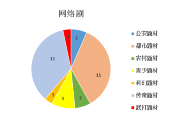 按题材划分,31部712集网络剧中,公安题材2部54集,都市题材11部245集,农村题材2部52集,青少题材3部48集,科幻题材1部40集,传奇题材11部260集,武打题材1部13集。