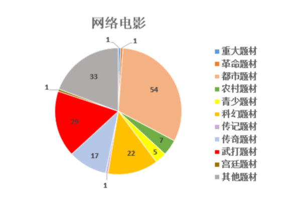 171部网络电影中,其中重大题材1部,革命题材1部,都市题材54部,农村题材7部,青少题材5部,科幻题材22部,传记题材1部,传奇题材17部,武打题材29部,宫廷题材1部,其他题材33部。