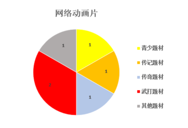 6部43集网络动画片中,青少题材1部9集,传记题材1部1集,传奇题材1部8集,武打题材2部12集,其他题材1部13集。